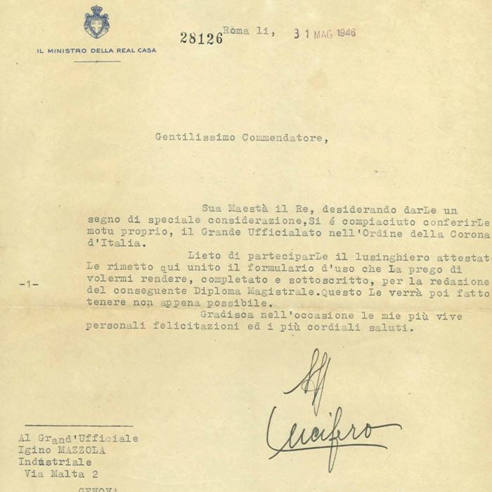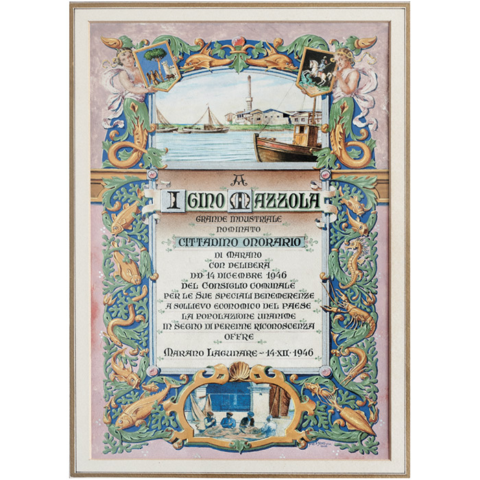 Igino Mazzola was appointed Grand Officer in the Order of the Crown of Italy and Honorary Citizen of Marano Lagunare.
